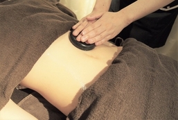 身体にホットストーンを乗せていき、じんわり温めた後、腸もみをします。