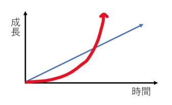 青線は「努力」を、赤線は「成長」を表しています。コツコツ努力をして、それも時間を費やせばそれだけ、努力の総量は増えていきますので、青線が右肩上がりになっています。ところが、成長とか成果というものは、はじめからその努力と比例しているわけではありません(赤線)。