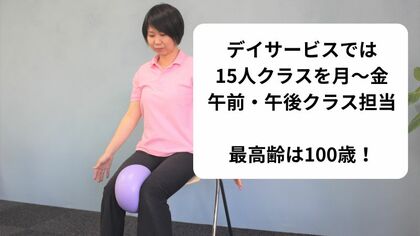 その後、33歳でデイサービスに転職をしました。介護予防運動指導員の資格を活かしたい!と思ったからです。この仕事が天職だと思うくらい本当に好きだったので、仕事休みの日に、前職のスポーツトレーナーさんから教えてもらったイベントに参加し、高齢者向けのエクササイズを学びに行っていました。ここでさらに軽度な運動のバリエーションを仕入れることになります。